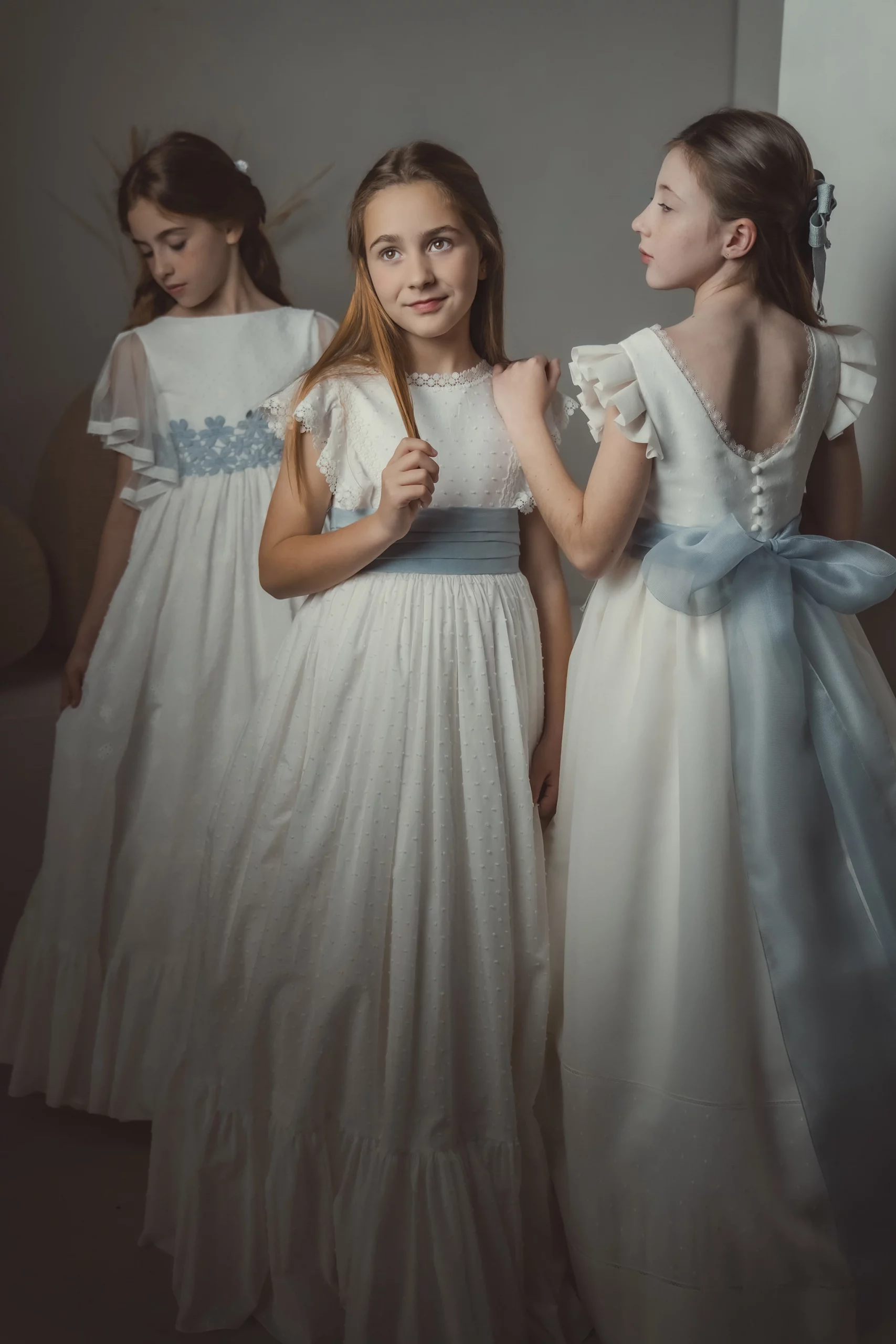 Nuestra colección de vestidos de comunion destaca por la calidad de sus tejidos, la comodidad en cada patrón y el cuidado especial por los acabados. Utilizamos encajes artesanales, plumeti, tul bordado, organza y algodones naturales para lograr vestidos ligeros, románticos y llenos de encanto.